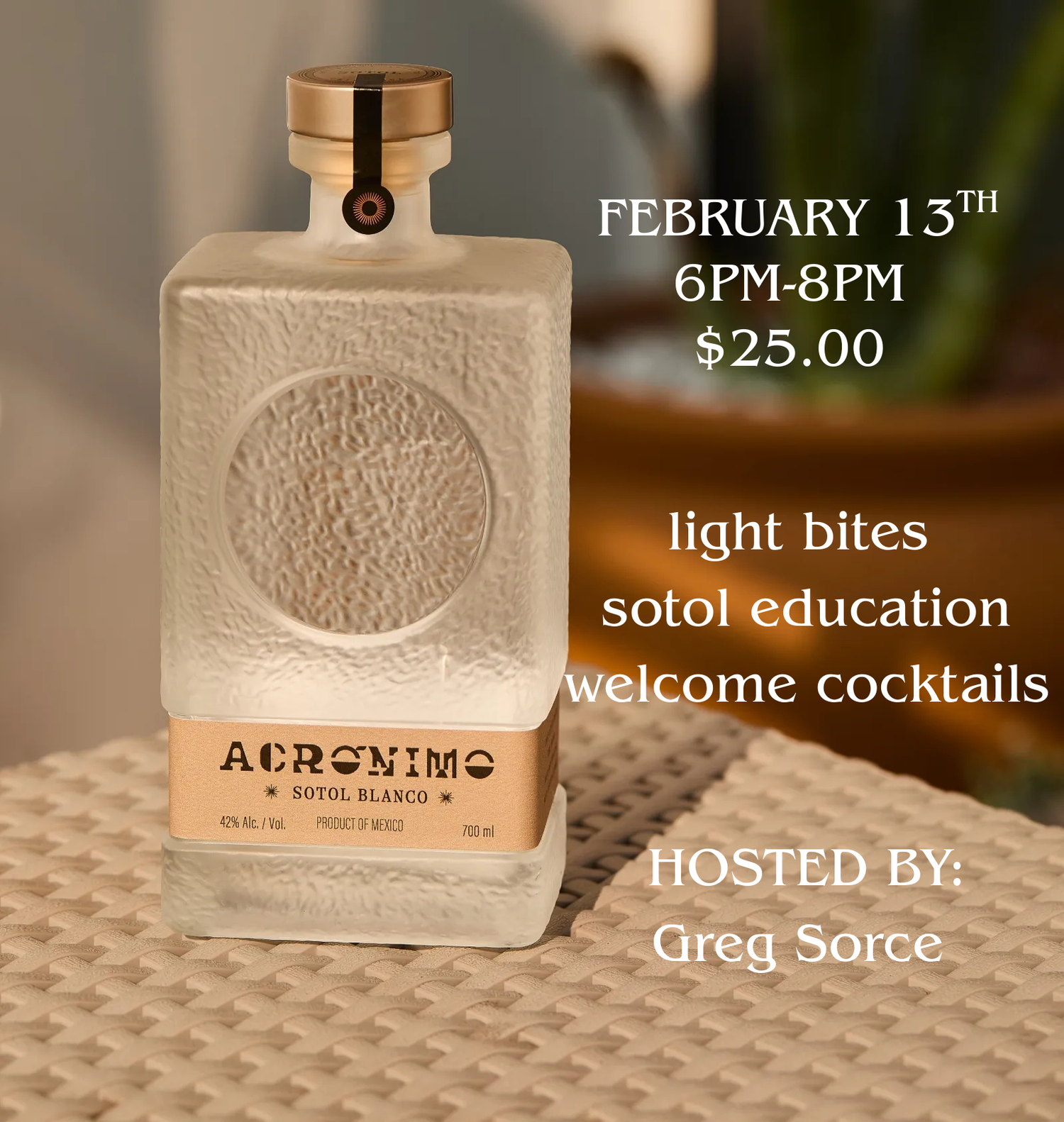 Join us and Greg as he educates everything Acronimo Sotol Blanco stands for and the history behind the brand. Enjoy light bites and welcome cocktail as you prepare yourself for a night of good libations.